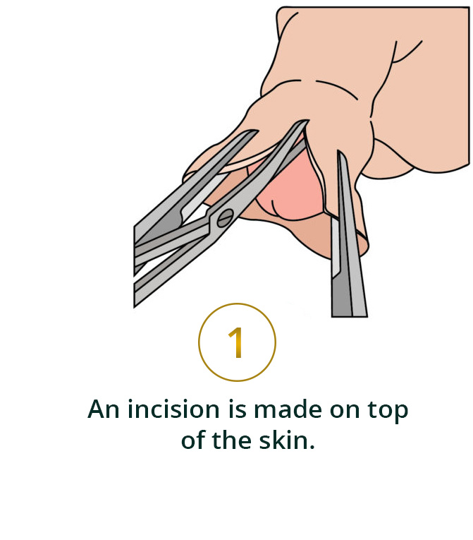 - The foreskin is stretched and retracted to reveal the head of the penis.