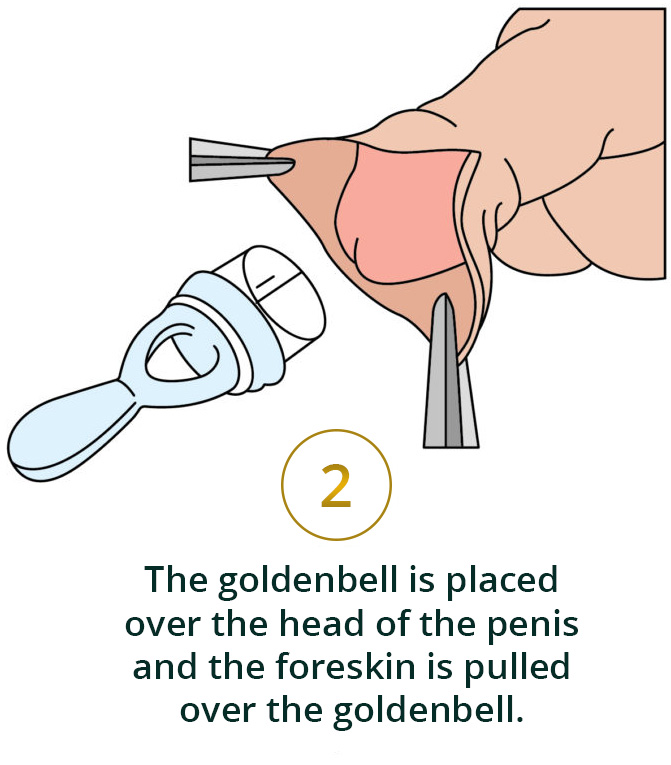 - The Goldenbell ring comes in a variety of sizes. After selecting the appropriate size, the ring is passed over the head of the penis.